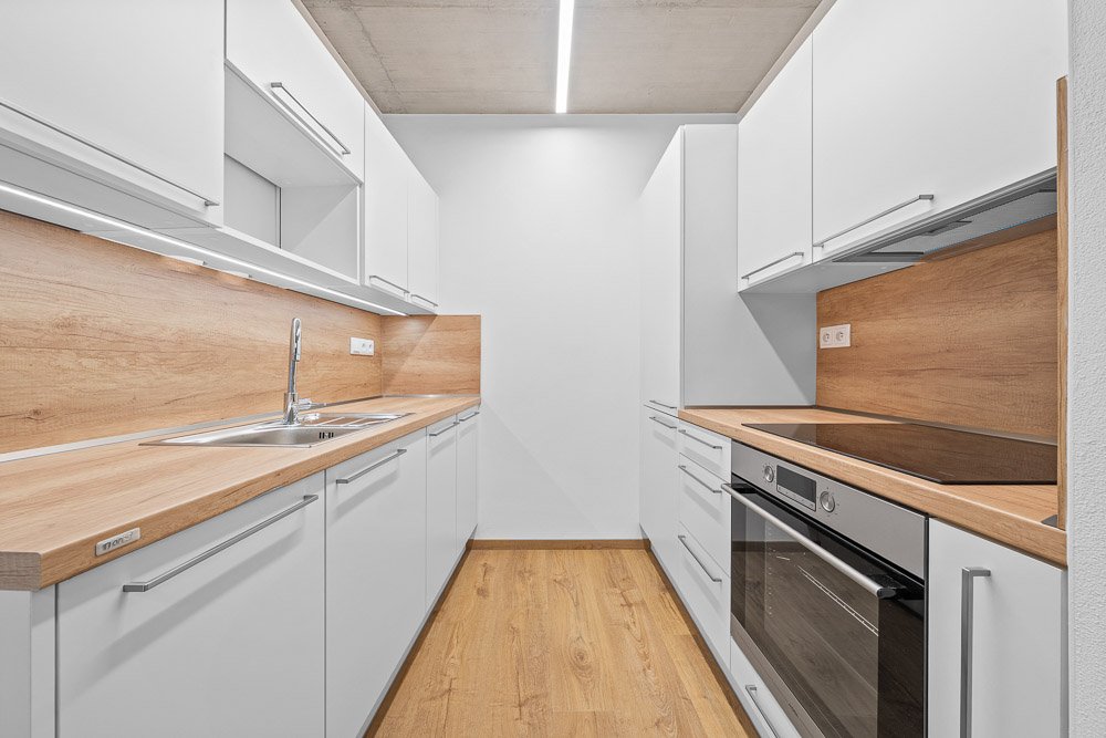 - Kuchyňská linka se spotřebiči: indukční varná deska, elektrická trouba, digestoř, lednička s mrazničkou, příprava pro myčku
